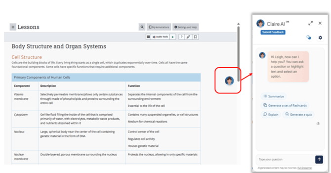 Navigate to Claire AI: Once logged in to the product, you will find Claire AI located within the module content. You will need to acknowledge and consent to the AI Terms & Conditions to access Claire AI. From here, learners can start using Claire AI. Click on the Claire AI icon, enter a prompt, and wait for a response.